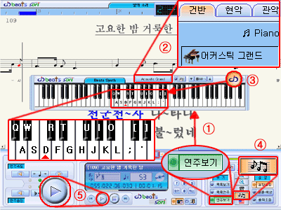 ¨è [Song]Æ®·¢ÀÇ [¿¬Á־DZâ(¼±ÅÃ)]Ç׸ñÀ» Ŭ¸¯ÇÏ¿© ¿¬Á־DZ⸦ [°Ç¹Ý] ÅÇÀÇ [Acoustic Grand(¾îÄ¿½ºÆ½ ±×·£µå)] ¾Ç±â¸¦ ¼±ÅÃÇÕ´Ï´Ù. ¹öư Ŭ¸¯ÇÏ¿© À½Çâ¼³Á¤¿¡ [¾îÄ¿½ºÆ½ ±×·£µå] ¾Ç±â¸¦ Àû¿ëÇϰí, ¹öưÀ» Ŭ¸¯ÇÏ¿© [¾Ç±âº¯°æ] âÀ» ´Ý½À´Ï´Ù.